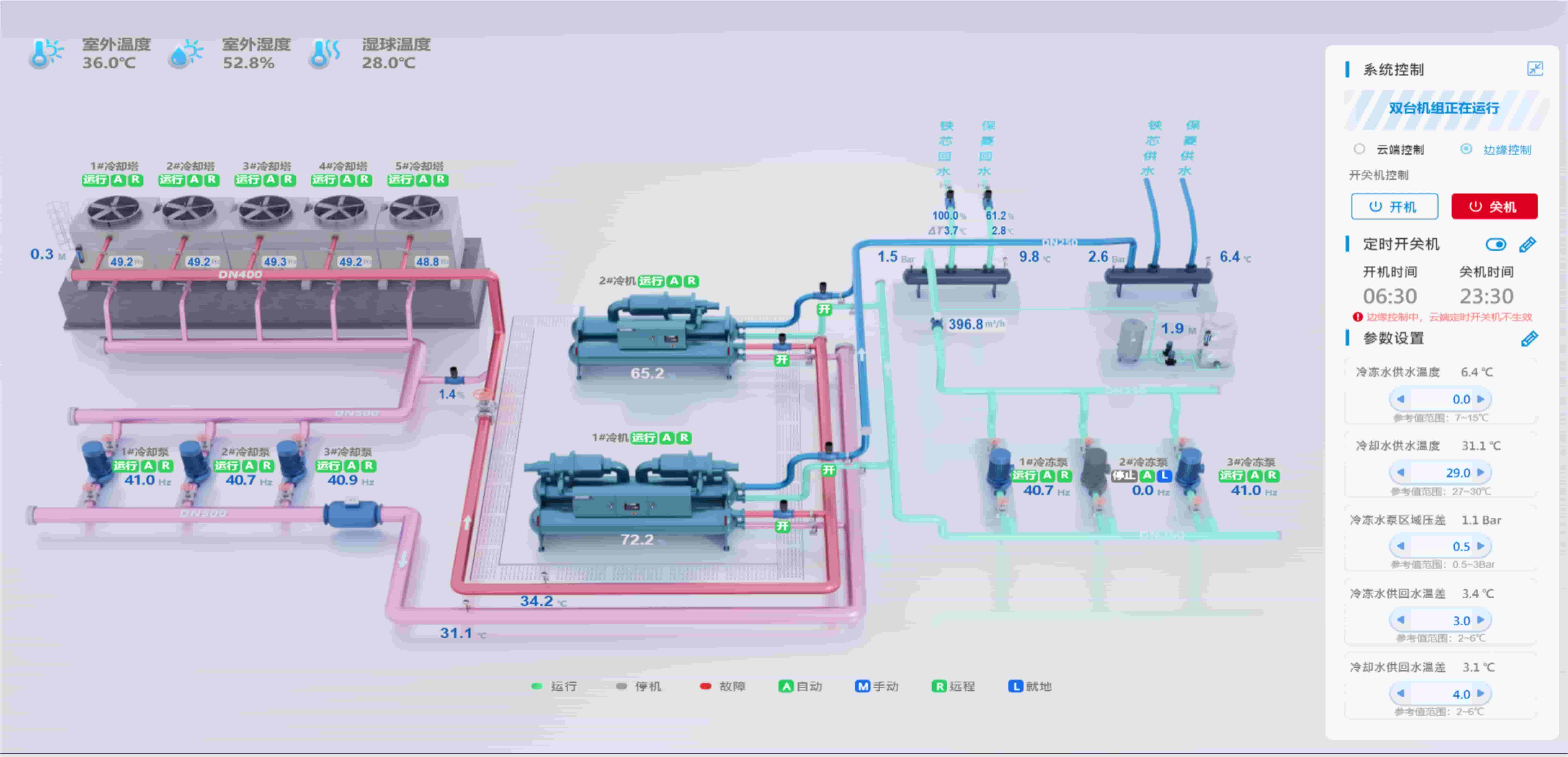 • 实时分析系统能效,提供不同工况的节能运行策略,并利用云边协同机制,实现运行参数的动态调整及设备启停的精准智控,在保证满足末端环境参数要求的基础上,实现最大化节能。